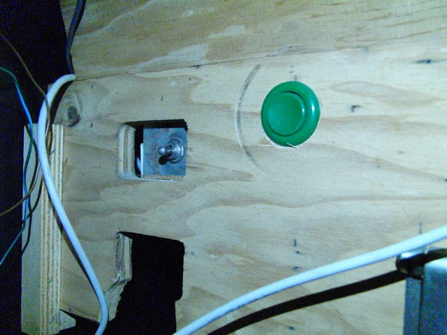 | qui sotto il tasto d'accensione a levetta originale rimosso dalla parte superiore del cabinato e riportato in luogo facilmente accessibile per l'accensione generale del cab. A fianco un pulsante arcade(verde) al quale ho collegato l'accensione del PC utilizzato. | ||