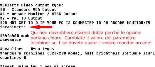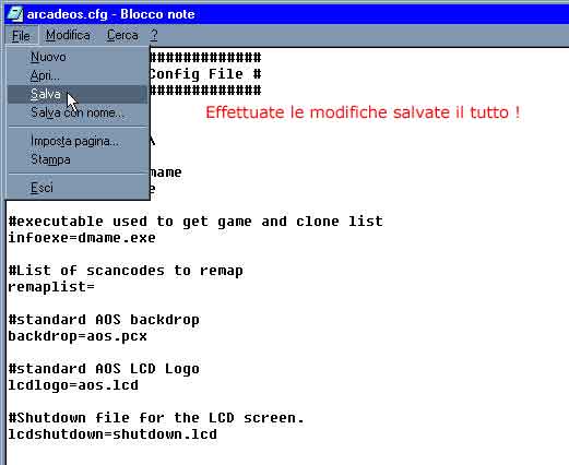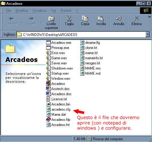 Passiamo alla modifica del file ARCADEOS.CFG Premetto che vi sto per indicare (al fine di farvi sbrigare subito) i parametri fondamentali da modificare ma vi segnalo anche che nella cartella di Arcadeos sono presenti in formato .doc (visibili con Word) i tutorials tecnici anche se in inglese.