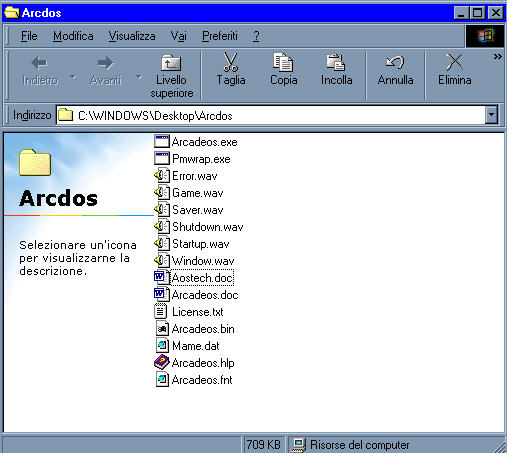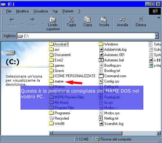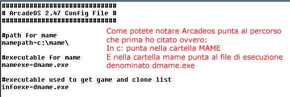 Per adesso non dovete fare nulla in questa cartella. Prima di metterci le mani dovete avere sul vostro pc un emulatore MAME. Attenzione perchè questo emulatore deve essere quello in DOS e per di più una certa versione, io ne ho provate diverse ed alla fine vi segnalo quella che a me funziona bene e che potete scaricare da qui ----->>>>>MAME 0.37 BETA 9. Decomprimetelo in una cartella chiamata mame nell'unità c: , alla fine il mame Dos si dovrà trovare in C:\MAME ciò risulta essere importante in quanto ArcadeOs punta direttamente questo percorso che altrimenti dovrebbe essere modificato nei parametri di configurazione.