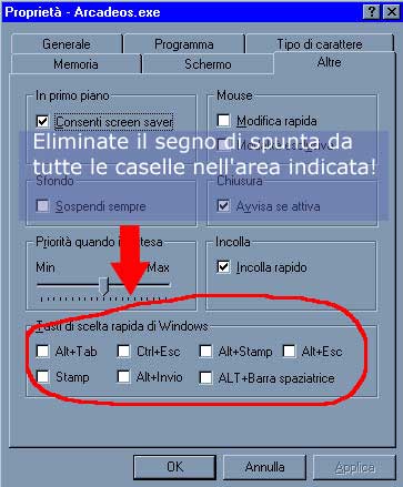 | Un ultima accortezza: Nella cartella di Arcadeos selezionate l'esegubile ARCADEOS.exe, cliccategli su' col tasto destro del mouse e selezionate proprietà dal menu a tendina. Scegliete la voce "Altre" e deselezionate tutte caselle dei tasti di scelta rapida di windows in basso alla finestra, questo è molto importante perchè se no avreste problemi nella pressione dei tasti durante la fase di gioco ovvero comandi non desiderati........Mi spiego meglio: Quando collegherete i pulsanti ed i joystick spesso (anzi molto spesso) durante le partite avviene la pressione simultanea di vari tasti e se le combinazioni non sono deselzionate si avrebbero eventi indesiderati alla pressione di tsati nello stesso tempo. Comunque date un'occhiata qui sotto per capire di cosa ho parlato. |