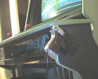 I comandi della playstation sono derivati dalla piastrina in bachelite di un normale joypad ( il secondo joypad per il plate 2 in queste immagini ancora non appare) in piu' il sistema è corredato anche di una LightGun di quelle comunemente usate per la PSX, ho cablato pero' allo scopo il suo cavo e fissato una fondina sul lato destro del cabinato.