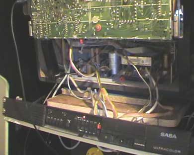 In questo cabinato ho montato un Tv Color Saba degli anni 80 proprio per mantenere viva la caratteristica di un tubo catodico bombato di altri tempi. ( ringrazio il mio amico Fabio M. per avermi fornito questo TV color) :-) Non avrei mai e poi mai usato un vero televisore in un cabinato ed in fatti ho deciso di farlo solo perchè posseggo più di un cab, a tal scopo ho usato un coin-op abbastanza recente, un BIG BOY che da quello che vedo è ancora presente nelle sale giochi di oggi. Il risultato è ottimo, il tv color dalle sembianze RETRO' lo ho piazzato dentro il mobile e non con poche difficoltà, lo ho aperto e disassemblato in alcune sue parti ed ho replicato il pannello dei comandi nella parte posteriore del cabinet.