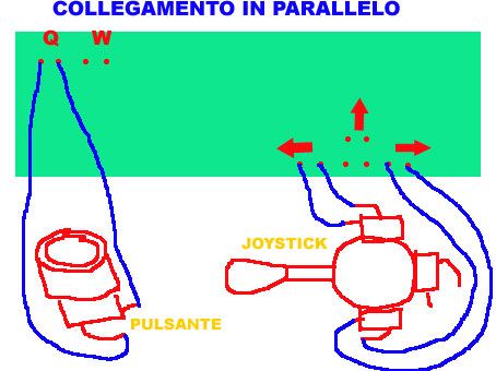In questo schema è riportato il concetto di come collegare pulsanti e joystick, saranno presenti 2 fili per ogni collegamento: i due fili son saldati sui 2 contatti del tasto della tastiera e dall'altra parte vanno a finire sullo switch presente sul joystick o pulsante. NELLA PAGINA PRINCIPALE DEL MIO SITO C'è UN LINK CHE DICE QUALI SONO TUTTI I TASTI DA COLLEGARE!!!! Quindi usate dei fili non troppo sottili per conferire un minimo di robustezza meccanica ne molto spessi.