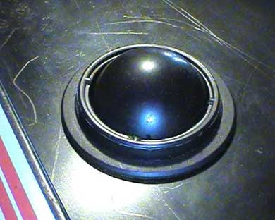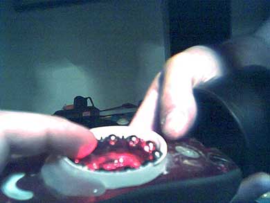Ora pero' le sferette schizzano via dalla loro sede con molta facilità! Bisogna creare un anello di contenimento. Ho rovistato ed ho trovato un coperchio di una bomboletta di vernice spray, ho visto che la misura è giusta e ne ho tagliato un anello nell'immagine qui sotto la si puo' notare, è bianca intorno alle sfere. Ora le sferette non possono piu' fuoriuscire dai bordi.